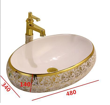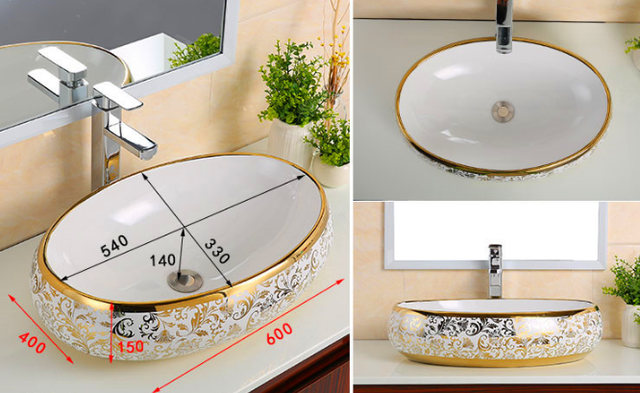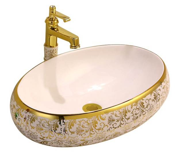 Стильна накладна раковина з золотим ажурним візерунком. Раковина цього виду вже завоювали багатьох споживачів європейського ринку і є стильним і практичним рішенням для сучасного інтер'єру ванної кімнати. Раковини даного типу гармонійно поєднуються зі змішувачами з нашого магазину. Ця раковина виготовлена з високоякісного і міцного матеріалу - кераміки. Поверхня гладка.Форма овальна. Модель представлена в 2-х розмірах. В комплект входить раковина зі змішувачем і з усім механізмом підключення.