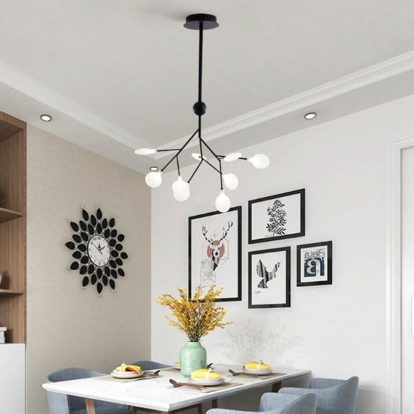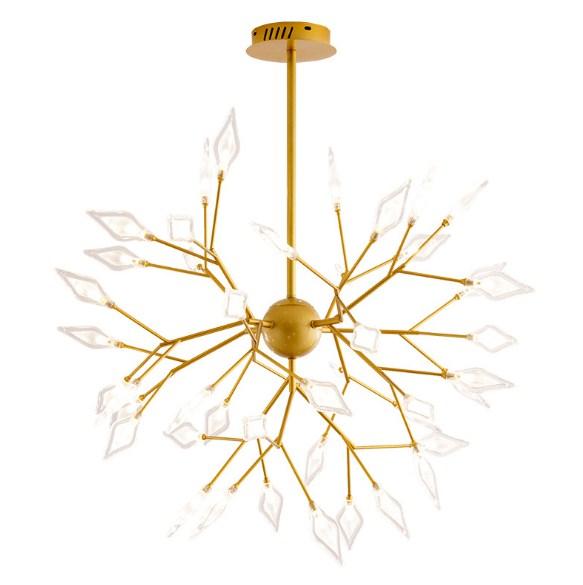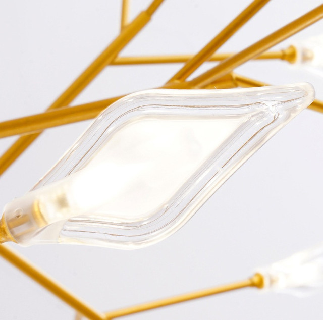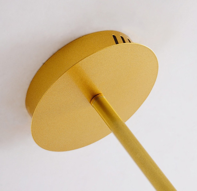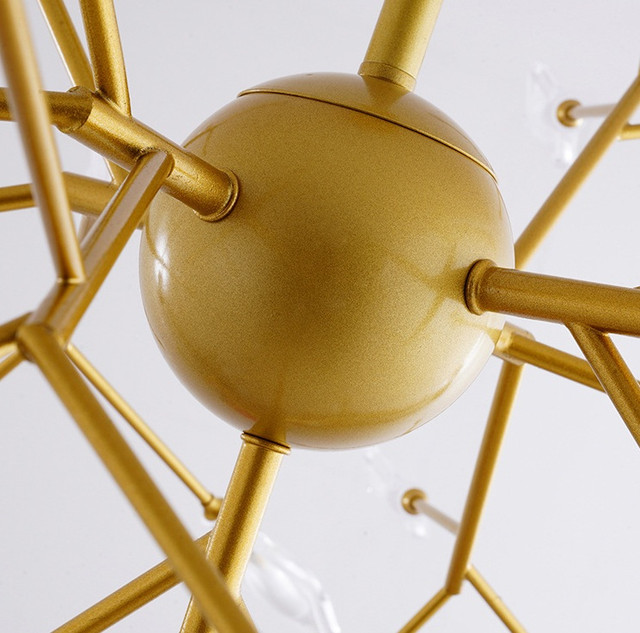 Люстра підвісна в скандинавському стилі гармонійно поєднується з декором практично будь-якого сучасного інтер'єру. Каркас виконаний з кованого металу високої якості в чорному і золотому кольорах, а скляні плафони оригінальної форми стануть прикрасою будь-якого приміщення.