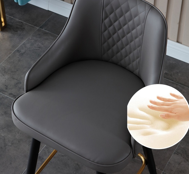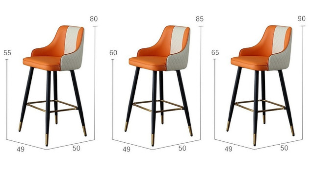 Високий і стильний шкіряний стілець в скандинавському стилі має універсальний дизайн, він чудово підійде як для барної стійки ресторану так і для стійки реєстрації готелю. Стілець виконаний з якісних матеріалів, каркас – з кованого металу з поліруванням і фарбуванням в чорно-золотистий колір, оббивка з натуральної шкіри наппа в оранжево-білому кольорі.