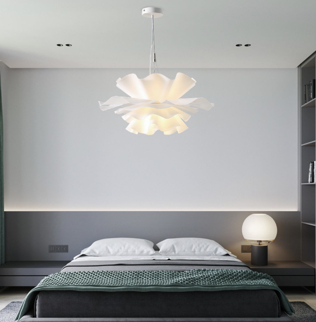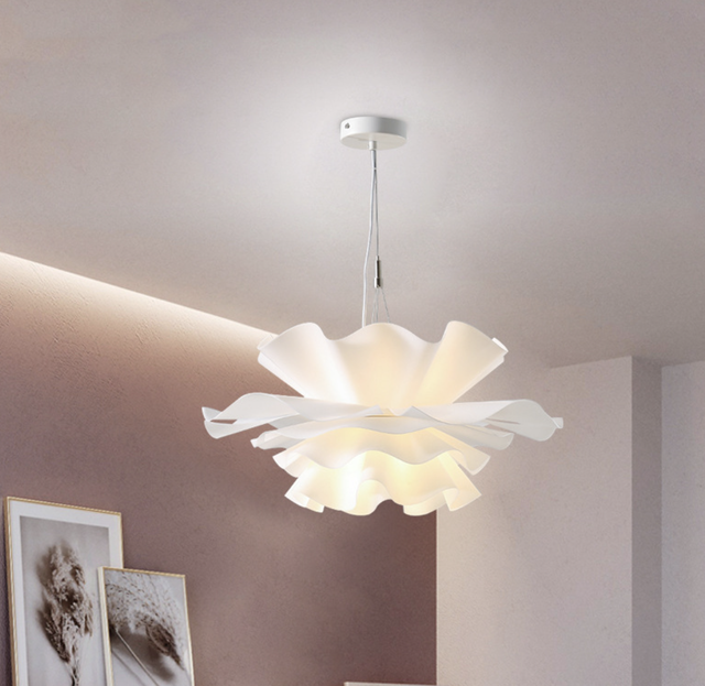 Каркас люстры изготовлен из прочного и долговечного кованного железа. Абажур, выполненный в виде цветка, сделан из матового белого акрила.