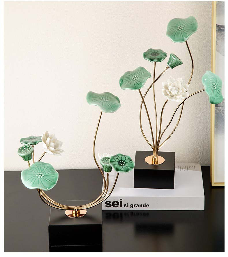 Це вишукана й елегантна прикраса для вашого дому. Вона зроблена в стилі нового китайського дизайну та являє собою керамічну фігурку аркуша лотоса. Ця статуетка ідеально підійде для прикрашання вітальні, телевізійної шафи або передпокою, додаючи в інтер'єр нотку вишуканості та розкоші. Виготовлена з якісного керамічного матеріалу, статуетка має міцність і довговічність. Вона ретельно вирізана та відполірована, щоб створити реалістичний вигляд і приємну на дотик поверхню. Завдяки своїй легкій і витонченій формі, вона легко впишеться в будь-який інтер'єр, стане прекрасним акцентом і приверне увагу гостей.\n